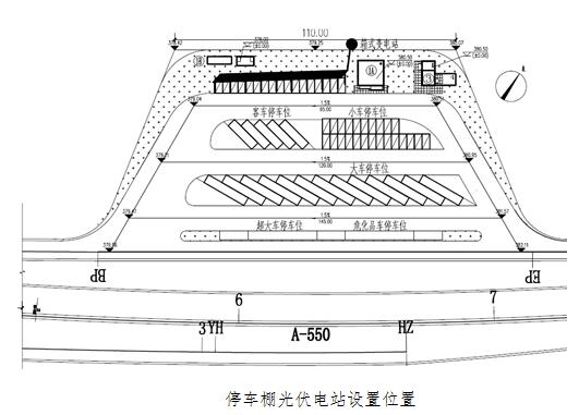 选择头道停车区供电负荷为公厕及超市照明,电采暖,污水处理,场区照明,供电负荷都是三级负荷。10kv外电线路接至停车区箱式变电站,高压配电与低压配电回路集中在箱式变电站。由箱式变电站配出回路放射式配电形式,为整个场区路灯,电采暖,超市,公厕配电。南侧场区供电仍由北侧箱式变电站埋管引出回路供电,南侧场区的灯光照明由北区照明回路引出连接。配电形式较为简单。用电量较小。采用车棚式光伏电站,不占用场区面积,不占用车位。不影响原停车区房建整体建筑风格,立面效果,场区整体景观效果。