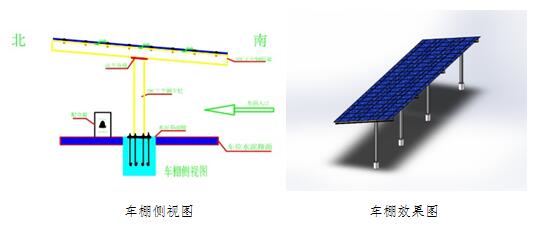 本次选择北区北侧小车停车位,设置车棚光伏电站,不影响原停车区房建整体建筑风格,立面效果,场区整体景观效果。光伏电站发电量基本满足场区日常用电需求,车棚光伏电站离箱式变电站位置接近,直流汇流箱和逆变器采用集成式户外一体式结构,直流电缆穿管较少,接线方便,易于维护。如果采用同时在南区设置车棚光伏电站,仍然需要经变流箱变成交流电,接至北侧箱式变电站,原有的交流回路无法利用,需要从新敷设管道,敷设直流线缆,主体单位和房建单位需要从新设计管道,造价过高。另外长距离发电300m,直流发电电压波形不太稳定。故选择仅在北区设置车棚变电站。