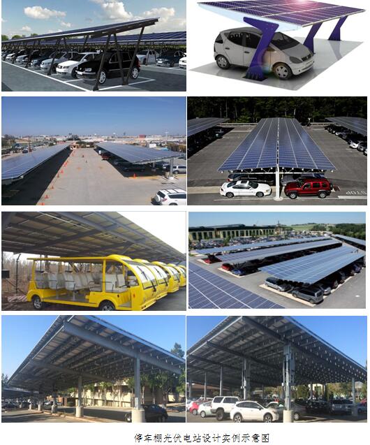 停车棚光伏电站设计实例见下图,光伏材料板都采用多晶硅, 光伏板支架形式根据外观,选择种类较多。