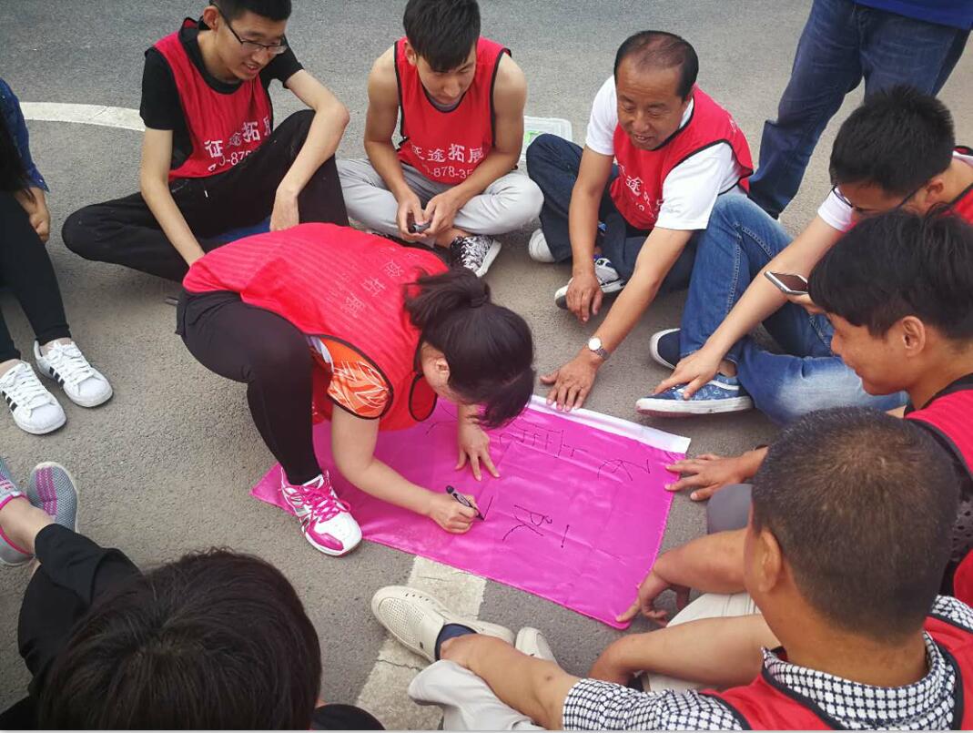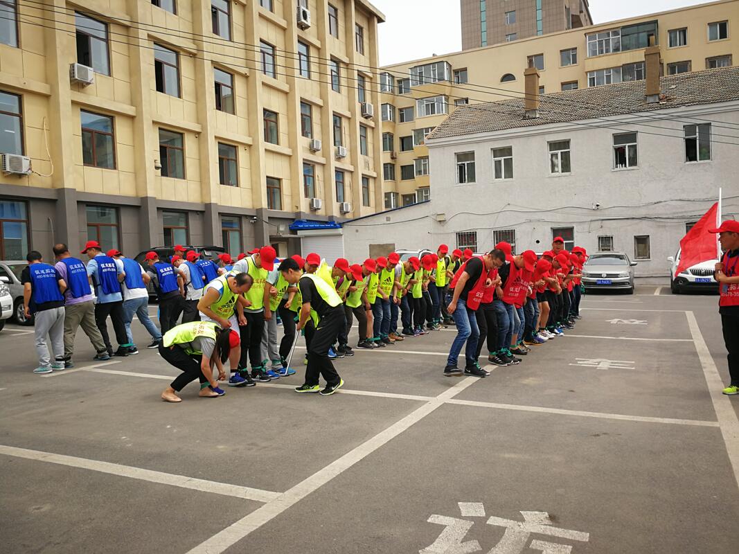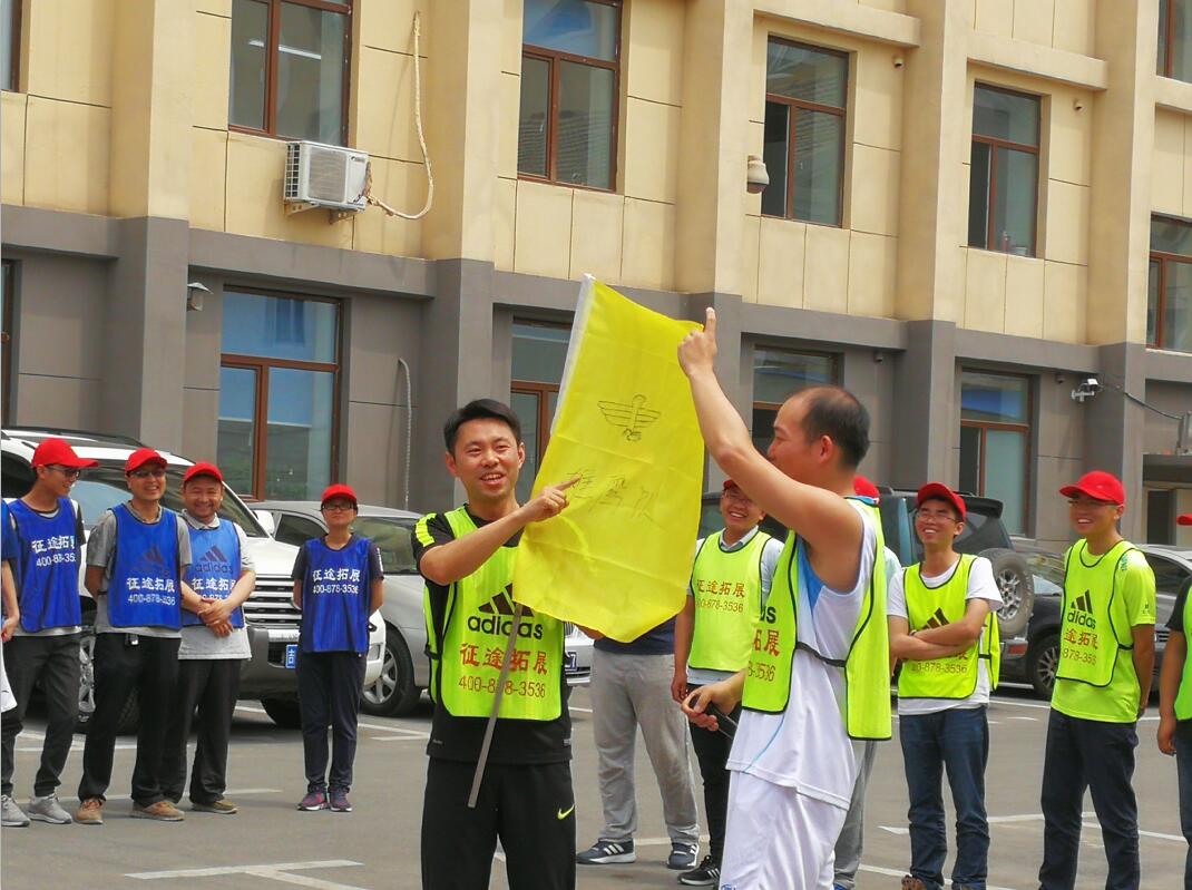 6月14日11点征途教练员来到院里布置场地,摆放器材,悬挂条幅。午餐后第一期参加训练的员工准时集合。刚刚吃过午餐,人们还没有从倦怠进入到训练的状态,就需要进行破冰和组队建设。经过分队,他们选出自己队长、旗手,共同为本队起队名、选队歌、设计口号、展示团队,经过这个环节后学员们很快融入到团队当中。