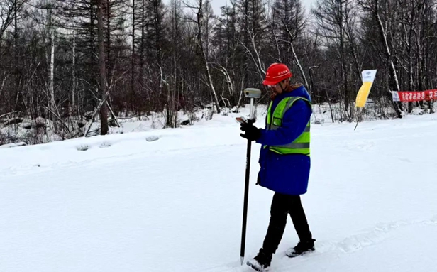 在01标各个测量现场,鲜红的党旗在风雪中格外醒目。该标段施工区域临近多个国家级自然保护区、水资源保护区及林场,包括公路改扩建、观景台、服务区、汽车停靠站等施工内容,测量工作标准高、要求严格、任务量大,时间紧。01标段党支部充分发挥战斗堡垒作用,确定测量组为党员先锋岗,组织党员冲锋在前,优质高效推进测量工作。现场技术员杨旭栋表示:作为党员,我们必须在关键时刻站出来,党旗在哪里,我们的责任就在哪里。