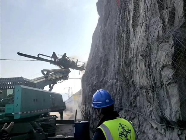 严格管理保安全。该标段建成运用“平安二航项目安全管理系统”,针对钻机、开挖等重点施工环节严格过程管理,依据地质条件设计完成混凝土浇筑基础加固20处,对高壁钻机等设备坚持“实名制”检查40 余次,确保设备运行状态良好。针对土石方开挖作业实行全程监督,严格遵循 “分层分段、自上而下、严禁掏洞” 原则,利用地质雷达探测地下管线、空洞,配备专业监测设备实时监测边坡位移、沉降。针对临江服务区建设面临的土石方供需矛盾,项目部坚持问题导向,科学制定施工方案及时解决这一难题。该标段严格遵循边境管理条例,排除传统爆破作业方式,经科学论证和方案比选,创新采用二氧化碳气体静态爆破技术并取得明显成效。