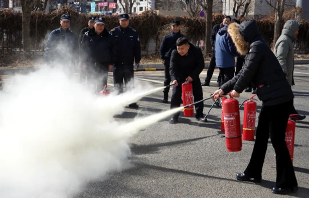 实战演练,提升技能。在模拟火灾应急救援中,起火点临近人员迅速到达现场,使用灭火器扑救初期火灾,预案人员快速响应到达岗位,楼内职工安全有序撤离火灾现场。之后,由消防教官示范干粉灭火器提、拔、握、压的正确使用方法,全员分批分次进行扑灭实际操作。