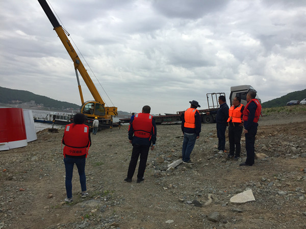 5月24日,在松花湖助航设施30米航标塔吊装之际,党委书记张彪率相关处室负责人对施工现场进行督导检查,张郁峰、彭红艳、朱翔鹏、李文超等随同检查。