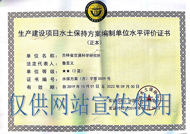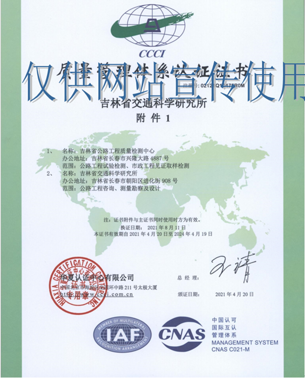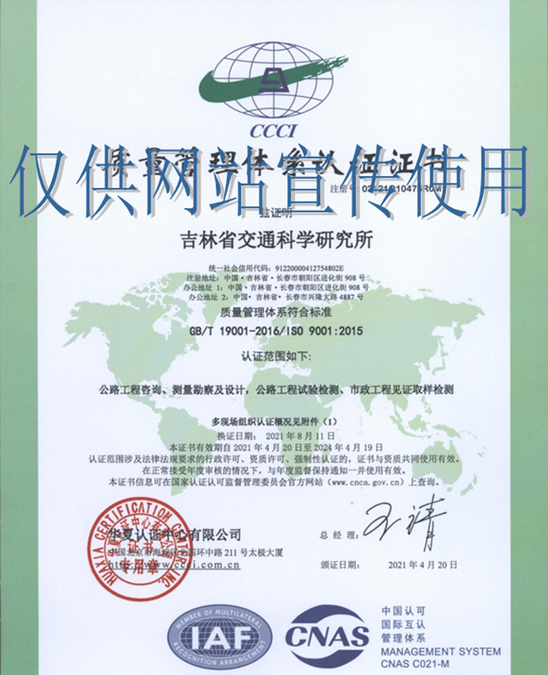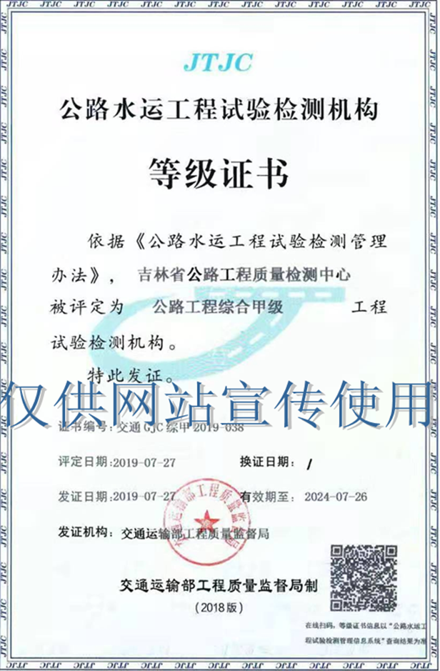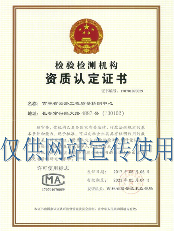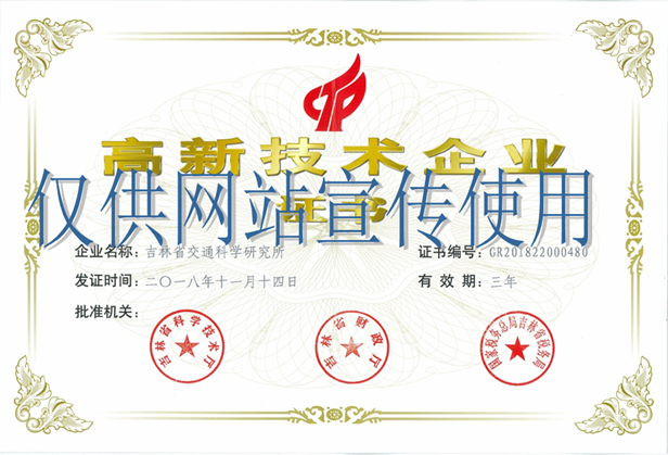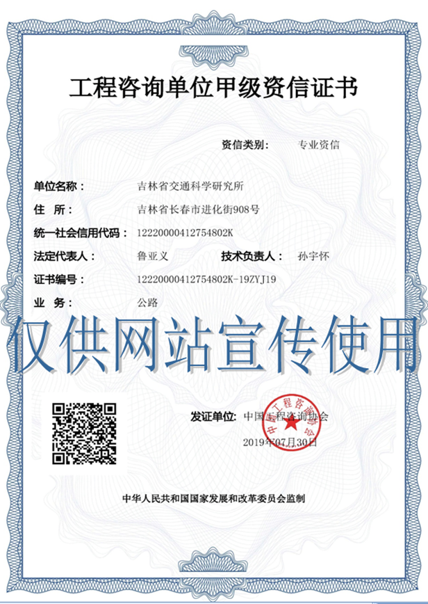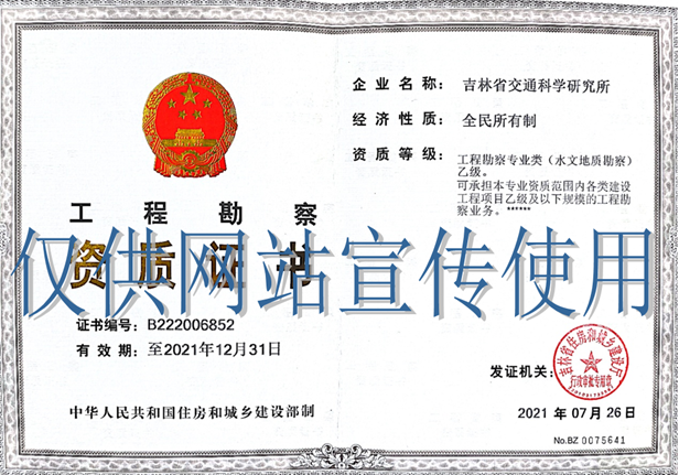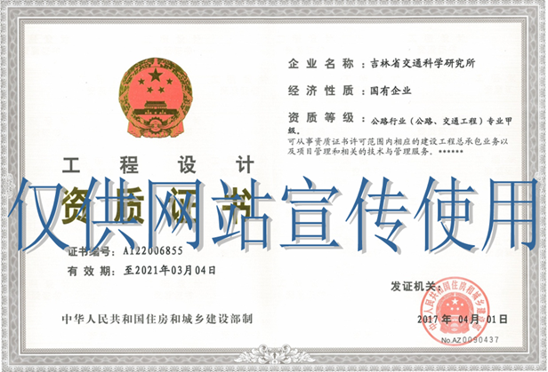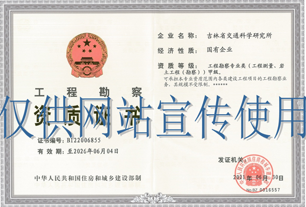 中华人民共和国交通运输部认定为交通行业季节性冻土区公路建设与养护技术交通行业重点实验室(长春);国家级高新技术企业;ISO9001质量管理体系认证企业;中华人民共和国住房和城乡建设部颁发的《工程勘察资质证书》工程勘察专业类(工程测量、岩土工程(勘察))甲级、水文地质勘察乙级;中华人民共和国住房和城乡建设部颁发的《工程设计资质证书》公路行业(公路、交通工程)专业甲级;中华人民共和国交通运输部颁发的《公路水运工程试验检测机构等级证书》公路工程综合甲级;吉林省住房和城乡建设厅颁发的《建设工程质量检测机构资质证书》市政工程见证取样检测;吉林省质量技术监督局颁发的《检验检测机构资质认定证书》;中国工程咨询协会颁发的《工程咨询单位甲级资信证书》;中国水土保持学会颁发的《生产建设项目水土保持方案编制单位水平评价证书》;成人网站 颁发的《交通运输企业安全生产标准化考评机构》道路运输、交通运输工程建设专业二级;交通运输部节能减排第三方审核机构等。