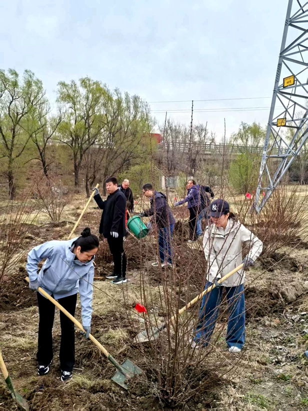 活动现场,大家化身为“绿色使者”,分工协作、默契配合。有人紧握铁锹,奋力深挖树坑;有人扶正树苗,确保根基稳固;有人提桶浇水,为新苗注入生机。从严谨的办公桌到充满泥土芬芳的劳动现场,大家将工作中的专注与细致融入每一个种植环节。尽管春寒料峭,但大家热情高涨,汗水与欢笑交织,不到两小时,一株株树苗在春风中整齐挺立,为园区再添一片“希望林”。