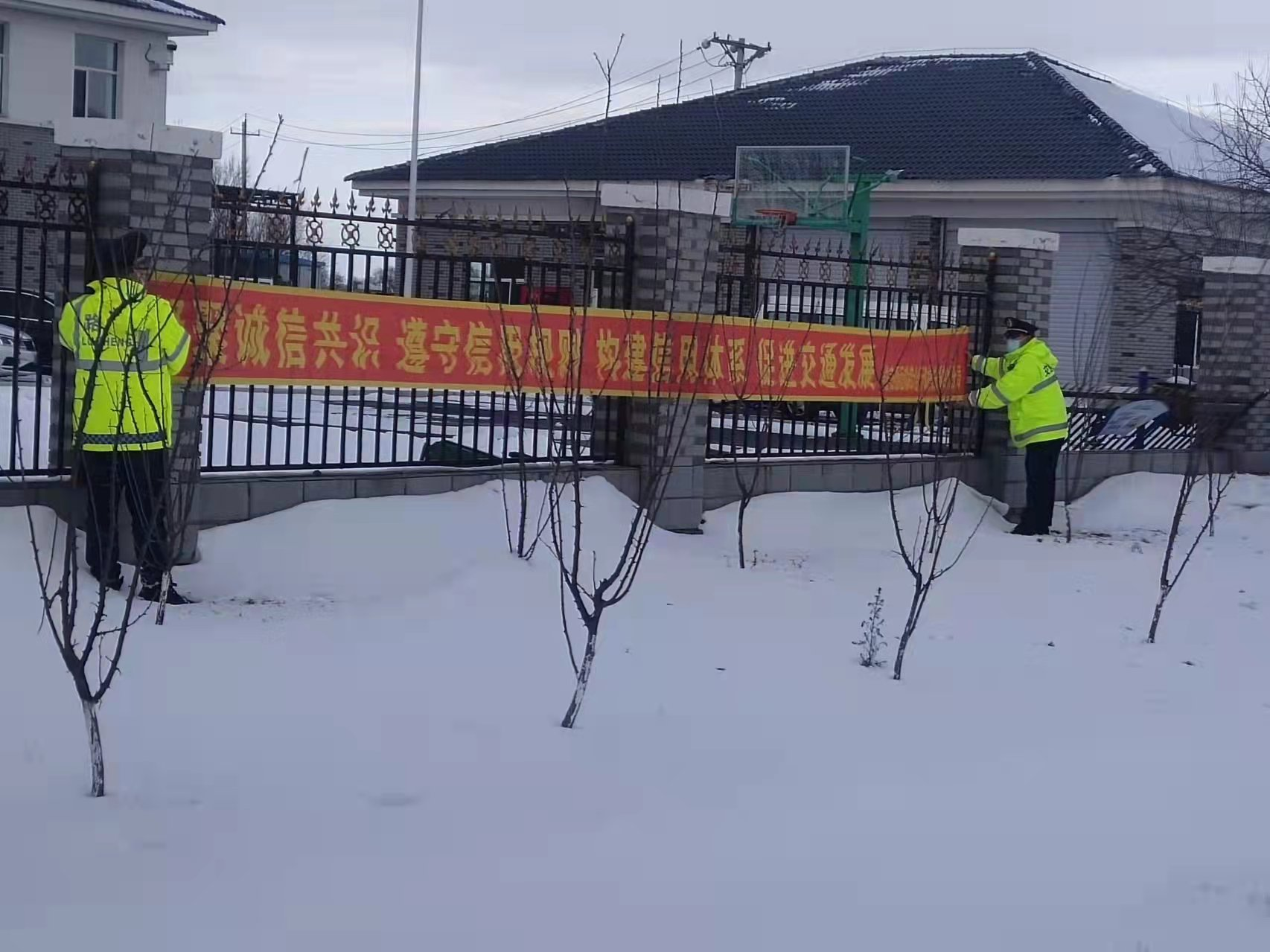 (图为白城分局执法人员在悬挂条幅)