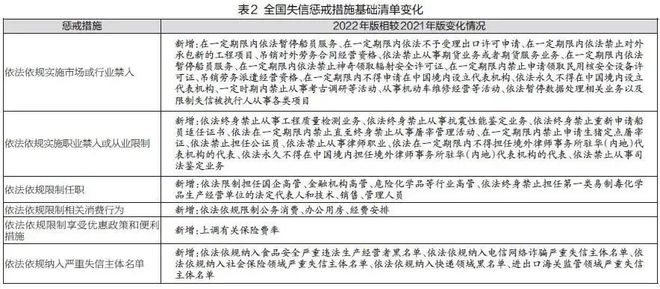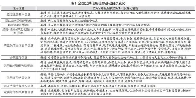 最近两年,国家发展改革委和中国人民银行按照《国务院办公厅关于进一步完善失信约束制度构建诚信建设长效机制的指导意见》(国发〔2016〕33号)要求,编制《全国公共信用信息基础目录》和《全国失信惩戒措施基础清单》2021年版,并在去年更新2022年版。《全国公共信用信息基础目录》明确了公共信用信息范围和依据(见表1),《全国失信惩戒措施基础清单》为每项失信惩戒措施找到了法律依据(见表2),界定了失信惩戒措施的种类及其适用对象,限制了失信主体减损权益或增加义务的范围,以法律为准绳,实现了社会信用体系建设有法可依。它们是我国社会信用体系建设法治化最新成果的体现,对于规范公权力主体的权力运行、保障私权利主体合法权益具有重大的现实意义。