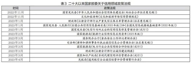 “水深则鱼悦,城强则贾兴”,良好的营商环境将吸引更多的投资、促进企业的发展,推动经济繁荣和社会和谐。党的十八大以来,习近平总书记高度重视优化营商环境,强调“营商环境只有更好,没有最好”。中共中央办公厅、国务院办公厅印发的《关于推进社会信用体系建设高质量发展促进形成新发展格局的意见》(中办发〔2022〕25号)指出,完善的社会信用体系是供需有效衔接的重要保障,是资源优化配置的坚实基础,是良好营商环境的重要组成部分,对促进国民经济循环高效畅通、构建新发展格局具有重要意义。党的二十大报告提出,要完善社会信用等社会主义市场经济基础制度。近日,国务院总理李强主持召开国务院常务会议,强调“要把打造市场化、法治化、国际化营商环境摆在重要位置,进一步稳定社会预期,提振发展信心,激发市场活力,推动经济运行持续回升向好”。为规范市场健康持续发展,二十大以来各部门相继出台相关政策来规范各行各业诚信经营,共同助力营造良好的营商环境(见表3)。