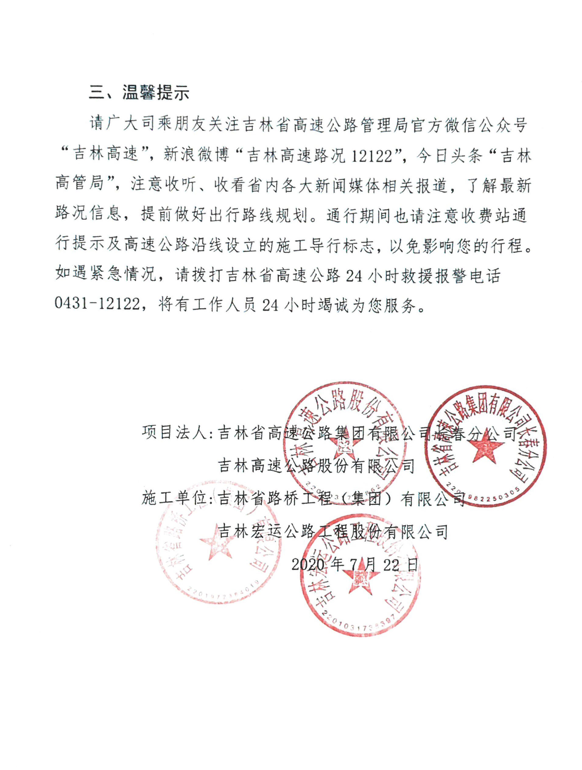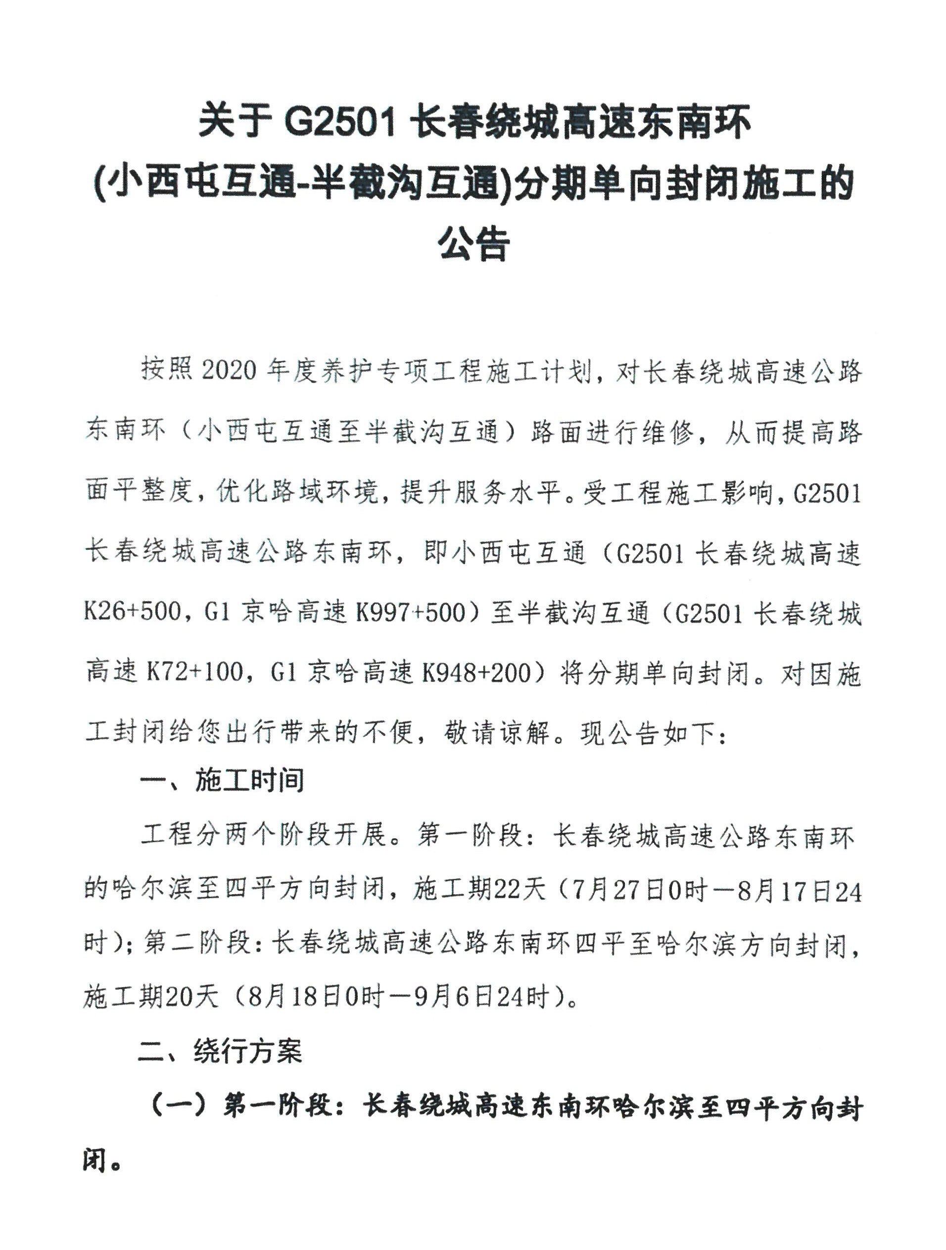 关于G2501长春绕城高速东南环(小西屯互通—半截沟互通)分期单向封闭施工的公告