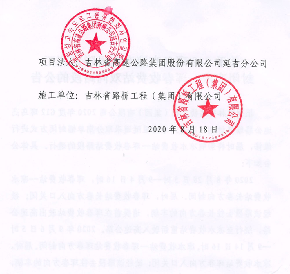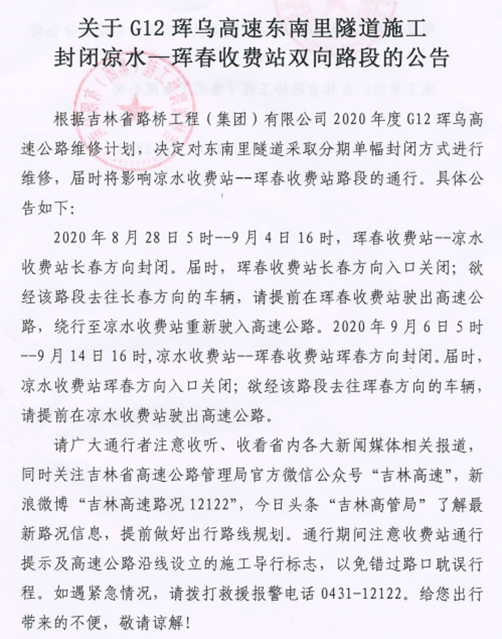 关于G12珲乌高速东南里隧道施工封闭凉水—珲春收费站双向路段的公告
