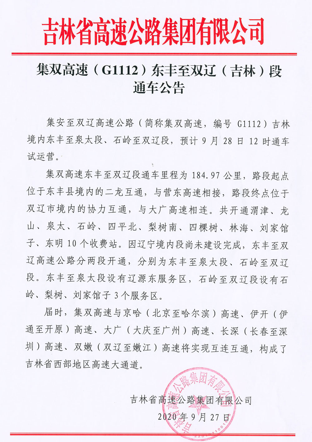 集双高速(G1112)东丰至双辽(吉林)段通车公告