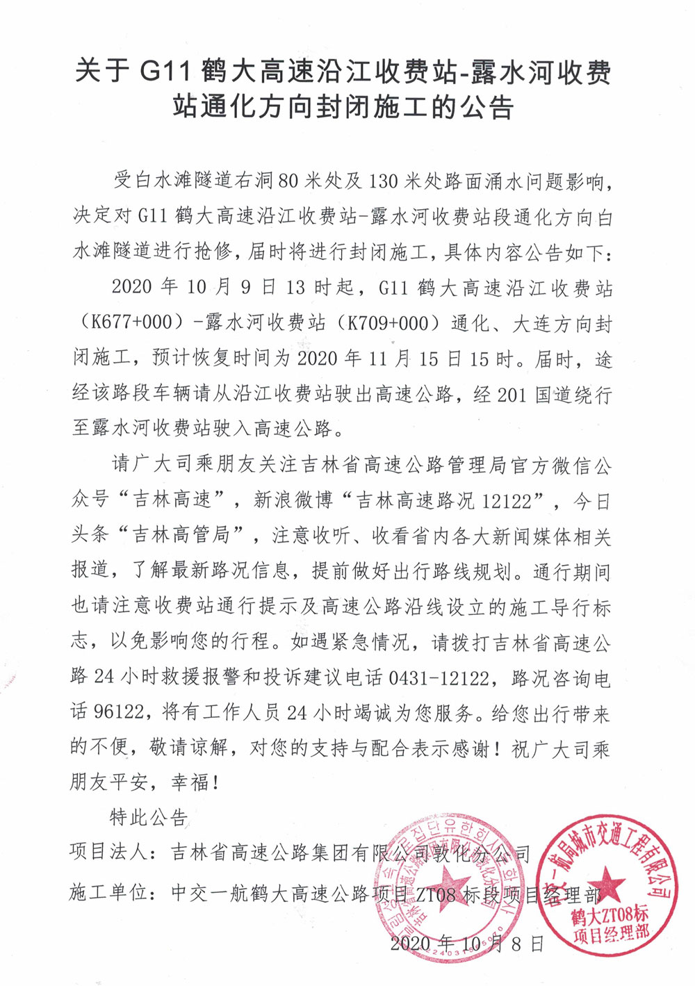 关于G11鹤大高速沿江收费站-露水河收费站通化方向封闭施工的公告