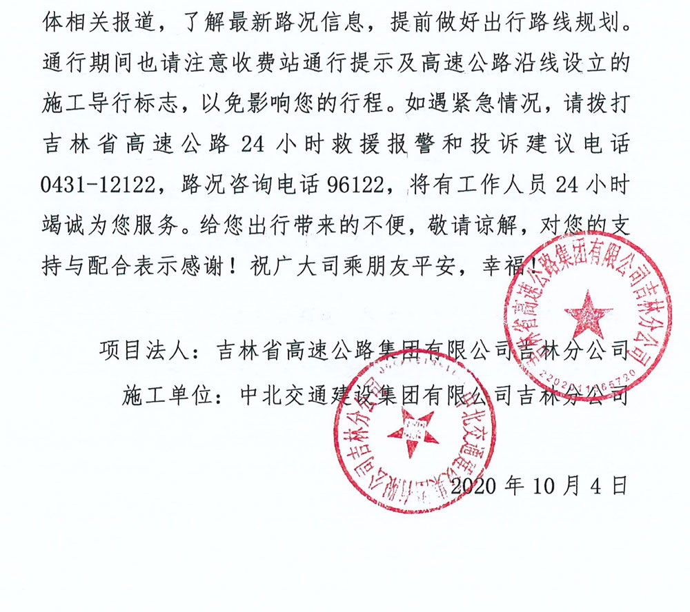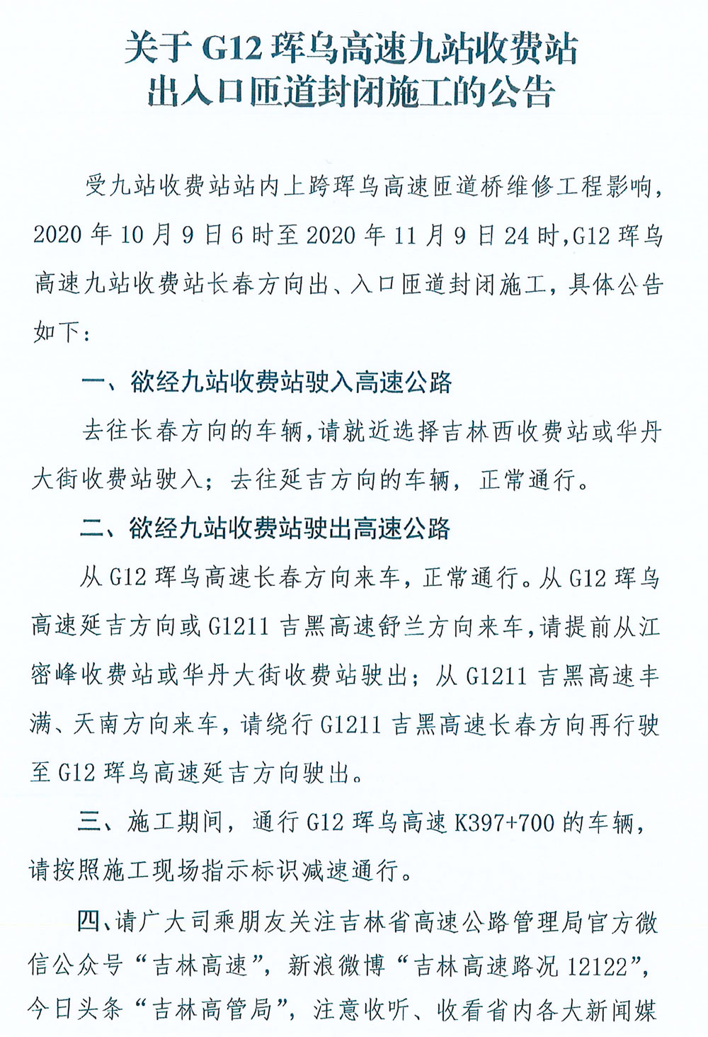 关于G12珲乌高速九站收费站出入口匝道封闭施工的公告