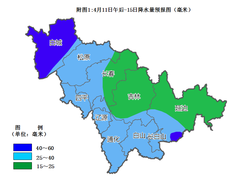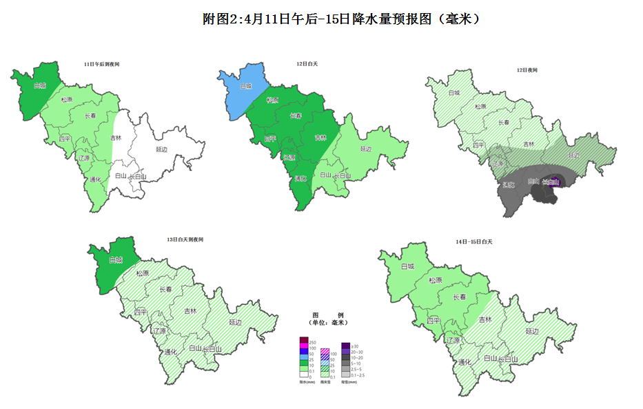 受高空冷涡和地面气旋共同影响,4月11日午后至15日,我省将有一次明显雨雪天气过程,降水主要集中在12日白天到13日白天。其中,白城有大雨转雨夹雪,过程降水量为40~60毫米,局部可达70毫米左右;松原、长春西部、四平、辽源、通化、白山、延边南部、长白山保护开发区有中雨转雨夹雪,其中东部山区有雨夹雪转大到暴雪,部分地方有暴雪或大暴雪,积雪深度可达10~20厘米,过程降水量为25~40毫米;其他大部地区有小到中雨转雨夹雪,过程降水量为15~25毫米(附图1)。