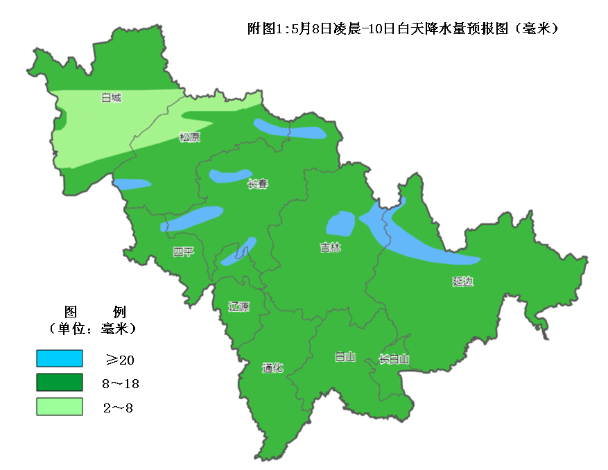 受高空槽影响,5月8日凌晨到10日白天,我省自西向东将有一次降雨天气,部分地方伴有雷电、雷暴大风等强对流天气。降水主要集中在8日凌晨到夜间。其中,白城北部和东南部、松原东部和南部、长春、四平、辽源、吉林、通化、白山、延边、长白山保护开发区有小到中雨,累计降水量8~18毫米,部分地方可达20毫米以上;其他地区有小雨,累计降水量2~8毫米。