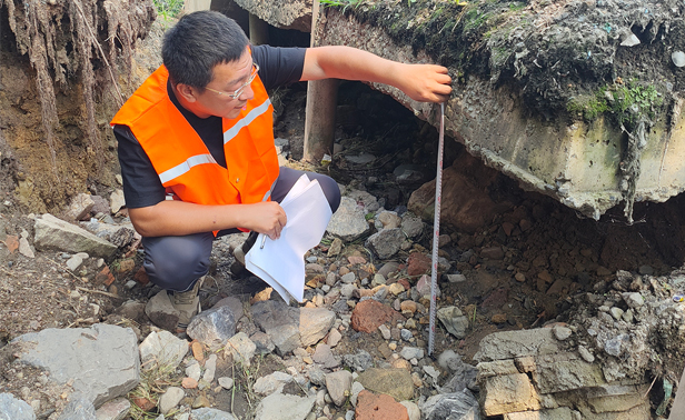 9:00,在辉三公路95公里+900米处,时佰林发现道路右侧路基局部毁坏,他立刻将这一情况在工作簿上详细登记,并在做好安全措施后拿出尺子测量毁坏部位尺寸。同行的工作人员打趣道:“别看咱们部长戴着眼镜,可像这些构筑物病害和路面病害都逃不了他的‘法眼’。”