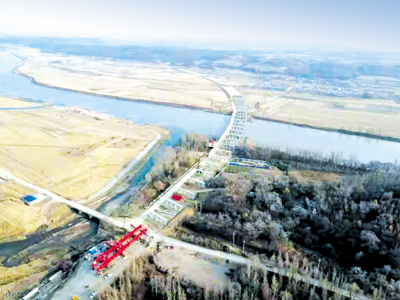 随着一台HZQ40-180步履式架桥机将重达近110吨、长30米的混凝土预制箱梁精准安装至设计位置,辉发河大桥首片箱梁顺利架设完成,这标志着蒲烟高速公路06工区施工生产取得又一个新突破。图为施工现场。(桦文)