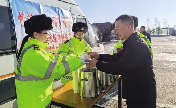 省交通执法局四平分局女子执法队在春运首日走进客运站、高速服务区开展“情满旅途·畅享交通”志愿服务活动,指导相关单位为旅客提供中途休整、热水供应、方便食品、手机充电、医疗救助等便民服务,引导群众安全文明有序出行。图为执法人员向过往司乘人员赠送银耳红枣汤。
